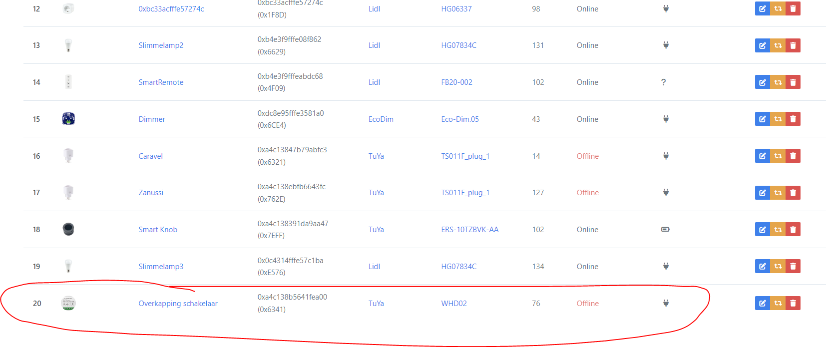 Probleem lijkt hem dus te zitten in de slimme schakelaar die offline blijft ondanks dat de lampen wel ontvangs hebben (zie afbeelding of nummer 20 op http://192.168.178.118:8080/#/)